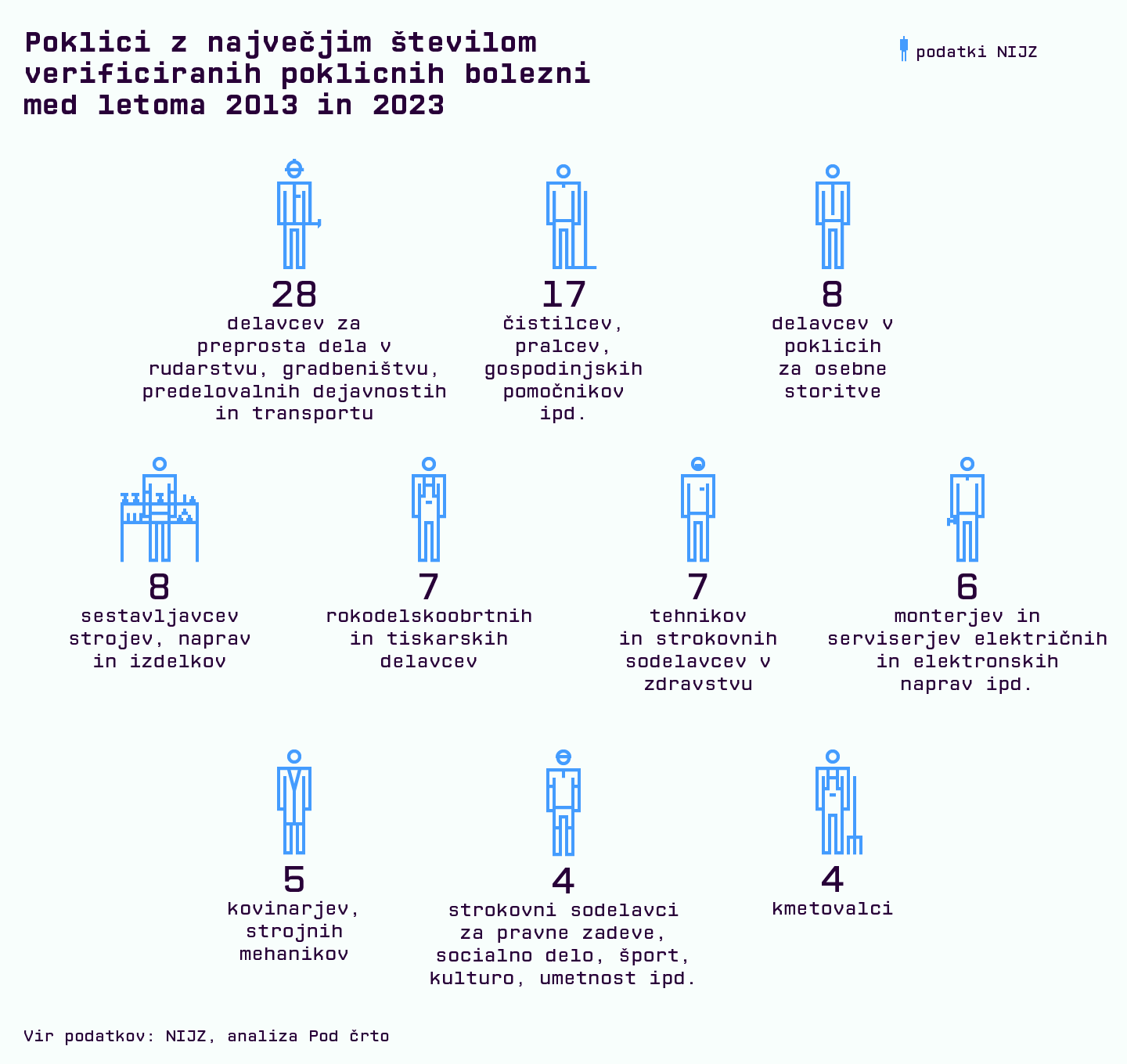 V analiziranem obdobju so poklicne bolezni priznavali med ugotavljanjem vzroka trajne nezmožnosti za delo na ZPIZ. Pri Pod črto smo analizirali samo podatke, ki jih je NIJZ izluščil iz evidenc ZPIZ. Poklici v letnih poročilih Interdisciplinarne skupine strokovnjakov za leti 2023 in 2024 niso navedeni po standardni klasifikaciji poklicev, zato jih v analizi nismo upoštevali.
