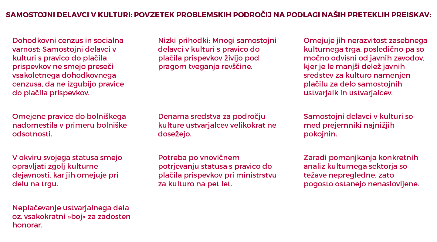 V dosedanjih preiskavah smo pri Pod črto identificirali deset problemskih področij, ki vplivajo na to, da samostojni delavci v kulturi ne uživajo socialne varnosti in da zaradi omejitev, ki izhajajo iz statusa in slabo razvitih zasebnih in javnih segmentov kulturnega trga, pogosto živijo v slabih ekonomskih razmerah.